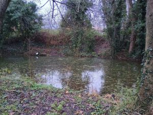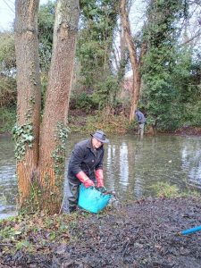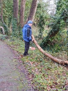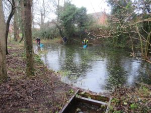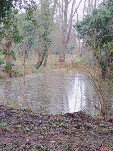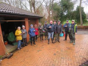Three of us were in the pond clearing out fallen leaves and branches to help maintain the ponds depth, whilst others were on the bank spreading out the rotten leaves to mulch down on the banks. One of the trees had fallen down which Ian and Chris were able to reduce in size and move out the way to maintain views of the pond. The ditch opposite the pond was also cleared and paths were swept, so despite a very dubious start to the day we achieved quite a lot.