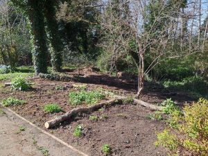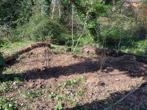 This week we cleared out all the ground elder in the front beds and created a new bed at the back by clearing fallen tree logs and clearing off ivy to allow more light. In the new bed we cleared the ground and planted two new multi stem Hazels.